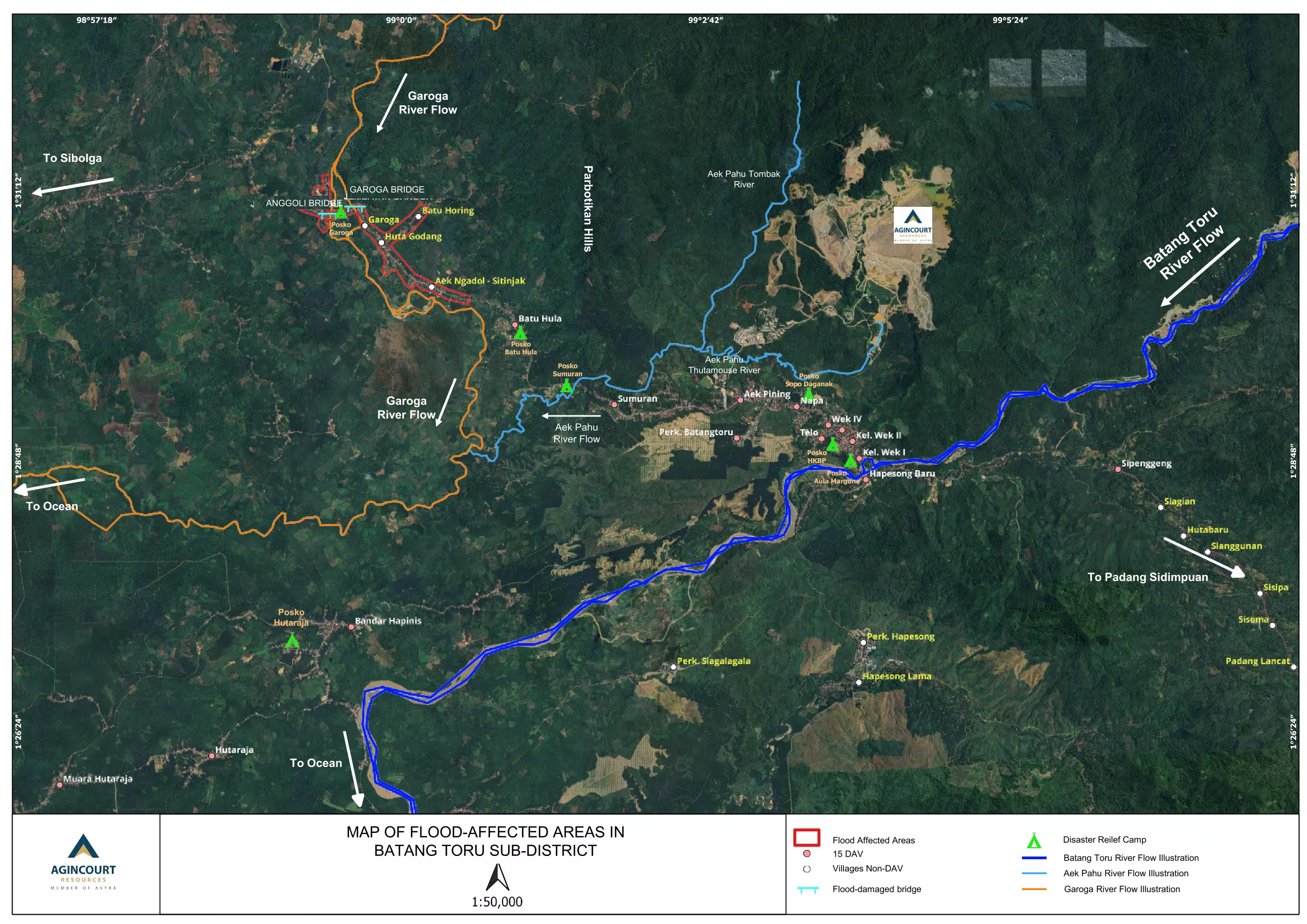 - Although several landslide events were observed within the Aek Pahu sub-Catchment Area, the Aek Pahu River flow did not experience a flash flood phenomenon. In contrast with the Garoga River, the Aek Pahu river lacked the intensive input of mud and logs that typically causes massive blockages and triggers flash floods. Consequently, the fifteen (15) villages surrounding the mine, which are predominantly situated in the Aek Pahu sub-Catchment Area, experienced no significant impact. These villages are currently functioning as local evacuation centres.