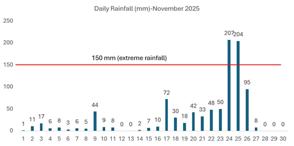 - The disaster was immediately preceded by the influence of the Senyar Cyclone, which generated rainfall of extremely heavy intensity across the South Tapanuli region. Based on statistical analysis, this rainfall volume was so extraordinary (refer to Figure 1 for data comparison) that represents a maximum rainfall event that has not occurred for at least the last 50 years. This exceptional volume of precipitation fell uniformly across a vast area of Northern Sumatra, critically impacting the Batang Toru Forest area. The Batang Toru Forest serves as the upstream headwaters for the primary rivers flowing through the Batang Toru Sub-district, including the Garoga River (Aek), Aek Pahu, and the Batang Toru River itself.