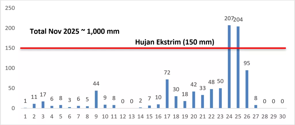 • Siklon Senyar menyebabkan hujan dengan intensitas sangat lebat di wilayah Tapanuli Selatan. Curah hujan ini begitu ekstrem dan secara statistik mewakili curah hujan maksimum yang tidak pernah terjadi setidaknya dalam 50 tahun terakhir (gambar 1). Hujan dengan volume luar biasa tersebut jatuh merata di seluruh Sumatra bagian utara termasuk kawasan Hutan Batang Toru, sebuah kawasan hulu dari sungai-sungai utama yang mengalir di Kecamatan Batang Toru, seperti Sungai (Aek) Garoga, Aek Pahu, dan Sungai Batang Toru.